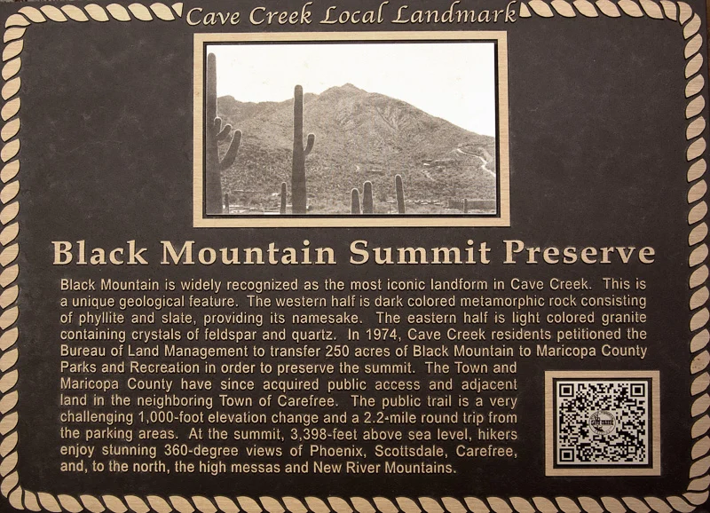 Black Mountain is widely recognized as the most iconic landform in Cave Creek. This is a unique geological feature. The western half is dark colored metamorphic rock consisting of phyllite and slate, providing its namesake. The eastern half is light colored granite containing crystals of feldspar and quartz. In 1974, Cave Creek residents petitioned the Bureau of Land Management to transfer 250 acres of Black Mountain to Maricopa County Parks and Recreation to preserve the summit. The Town and Maricopa County have since acquired public access and adjacent land in the neighboring Town of Carefree. The public trail is a very challenging 1,000-foot elevation change and a 2.2-mile round trip from the parking areas. At the summit, 3,398-feet above sea level, hikers enjoy stunning 360-degree views of Phoenix, Scottsdale, Carefree, and, to the north, the high mesas and New River Mountains.