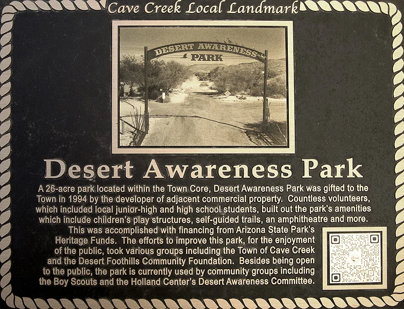 This was accomplished with financing from Ariona State Park’s Heritage Funds. The efforts to improve this park, for the enjoyment of the public, took place by various groups including the Town of Cave Creek and the Desert Foothills Community Foundation. Besides being open to the public, the park is currently used by community groups including the Boy Scouts and the Holland Center’s Desert Awareness Committee.