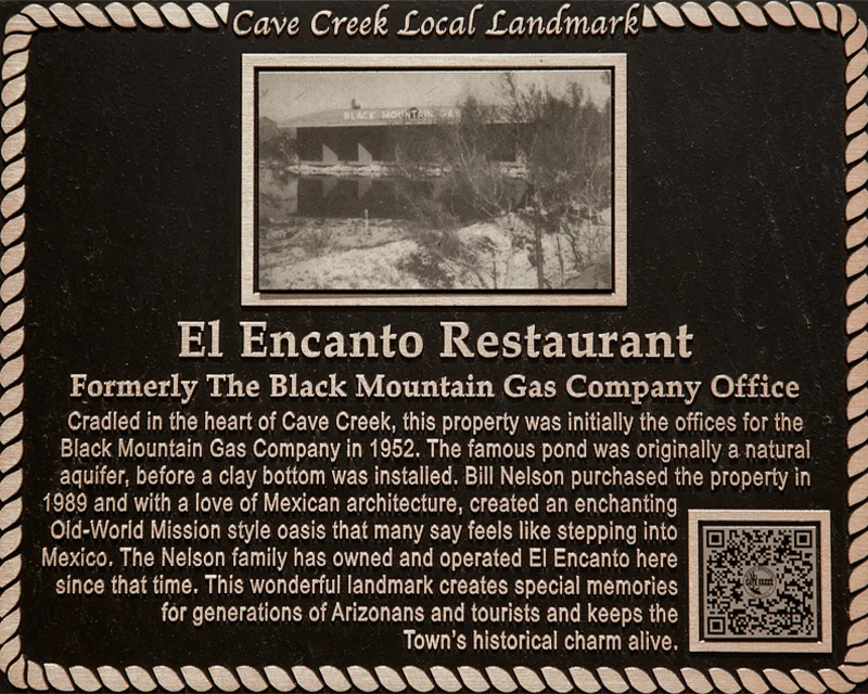 Cradled in the heart of Cave Creek, this property was initially the offices for the Black Mountain Gas Company in 1952. The famous pond was originally a natural aquifer, before clay bottom was installed. Bill Nelson purchased the property in 1989 and with a love of Mexican architecture, created an enchanting Old-World Mission style oasis that many say feels like stepping into Mexico. The Nelson family has owned and operated El Encanto here since that time. This wonderful landmark creates special memories for generations of Arizonans and tourists and keeps the Town’s historical charm alive.