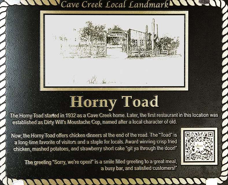 The Horny Toad started in 1932 as a Cave Creek home. Later, the first restaurant in this location was established as Dirty Will’s Moustache Cup, named after a local character of old.