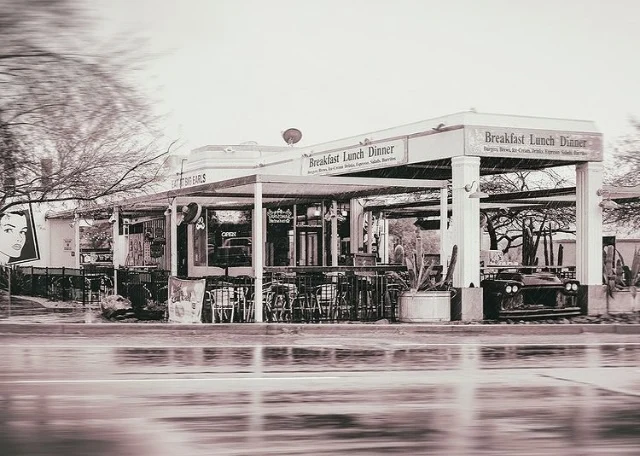 Currently this building is home to an Italian style restaurant. The building has a great history and holds the distinction as possibly the oldest continuously operated business site in the Town Core. Starting as a humble country store near the end of a dusty the Black Mountain Store served Cave Creek from the late 1940’s. Transformed in the early 1950’s to the Cave Creek Inn, it was a stop for weary travelers. The Inn became Trois Amis for a period, then a Mexican food restaurant, and currently our Oregano’s.