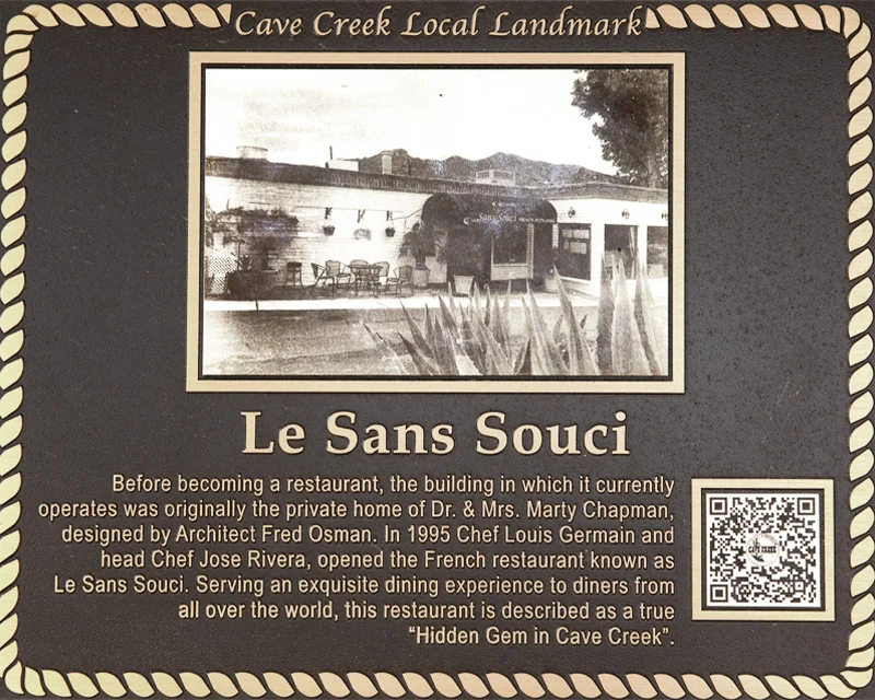 Before becoming a restaurant, the building in which it currently operates was originally the private home of Dr. & Mrs. Marty Chapman, designed by Architect Fred Osman. In 1995 Chef Louis Germain and head Chef Jose Rivera, opened the French restaurant known as Le Sans Souci. Serving an exquisite dining experience to diners from all over the world, this restaurant is described as a true “Hidden Gem in Cave Creek”.