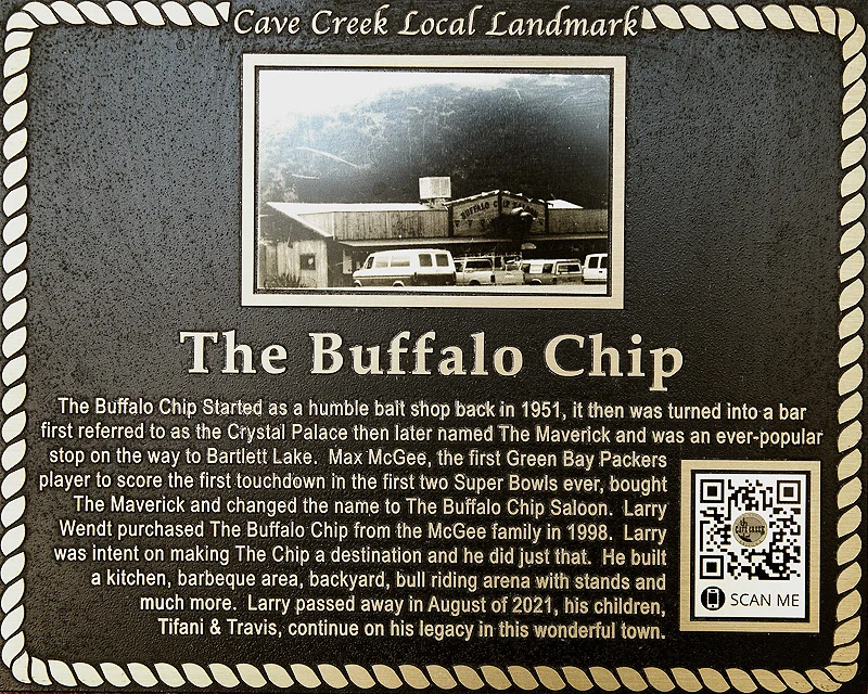 The Buffalo Chip started as a humble bait shop back in 1951, it then was turned into a bar first referred to as the Crystal Palace then later named The Maverick and was an ever-popular stop on the way to Bartlett Lake. Max McGee, the first Green Bay Packers player to score the first touchdown in the first two Super Bowls ever, bought The Maverick and changed the name to The Buffalo Chip Saloon. Larry Wendt purchased The Buffalo Chip from the McGee family in 1998. Larry was intent on making The Chip a destination and he did just that. He built a kitchen, barbecue area, backyard, bull riding arena with stands and much more. Larry passed away in August of 2021, his children, Tifani & Travis, continue on his legacy in this wonderful town.